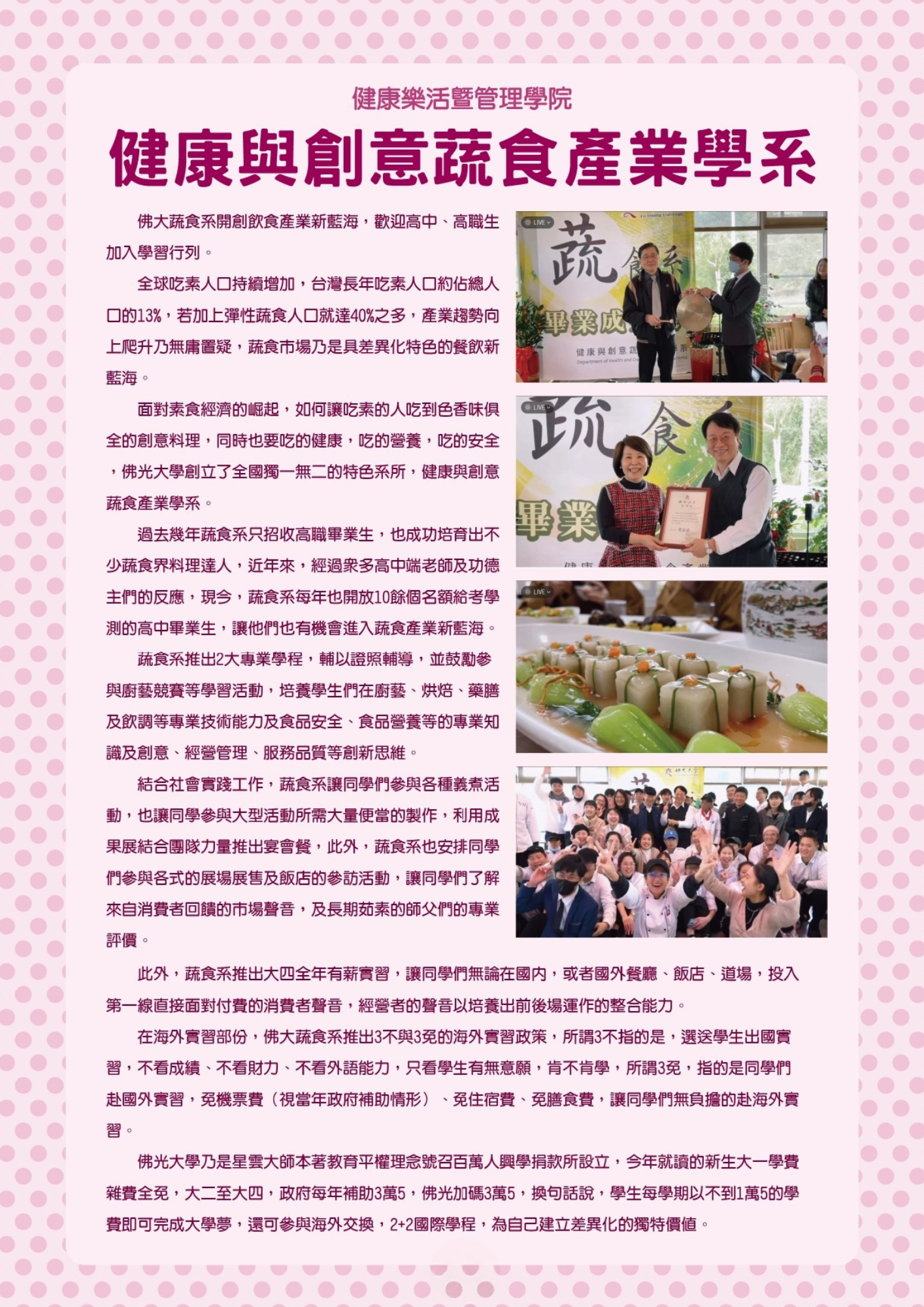 看完簡單的介紹後,到健康與創意蔬食產業學系網頁,了解更多吧~ 或是有相關問題想要了解,也可以填寫諮詢表單唷! 與健康與創意蔬食產業學系聯繫 學系位置:26247宜蘭縣礁溪鄉林美村林尾路160號 海淨樓110室 TEL:886-3-9871000 轉 22101 FAX:886-3-9871866 EMAIL:vegetarian@mail.fgu.edu.tw